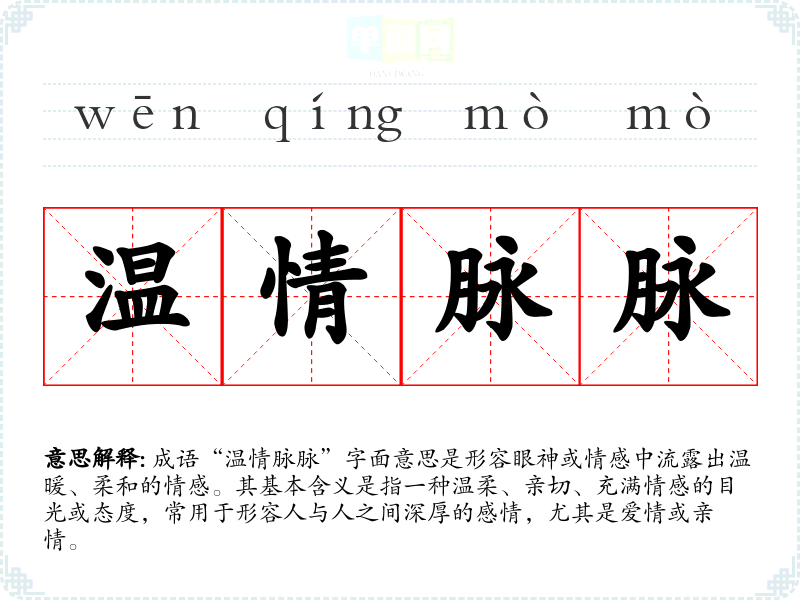 成语“温情脉脉”字面意思是形容眼神或情感中流露出温暖、柔和的情感。其基本含义是指一种温柔、亲切、充满情感的目光或态度,常用于形容人与人之间深厚的感情,尤其是爱情或亲情。