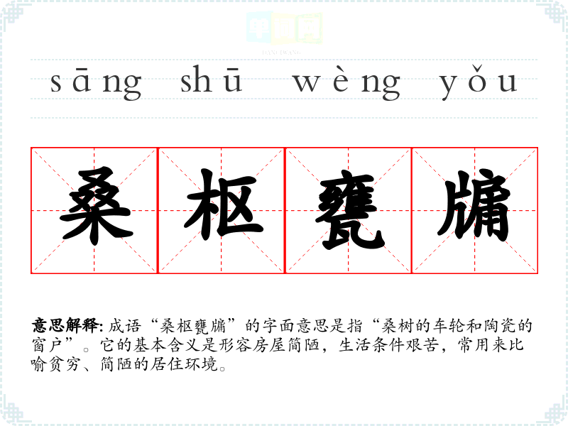 成语“桑枢甕牖”的字面意思是指“桑树的车轮和陶瓷的窗户”。它的基本含义是形容房屋简陋,生活条件艰苦,常用来比喻贫穷、简陋的居住环境。