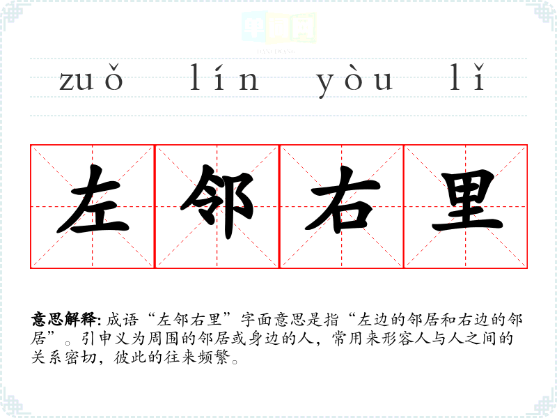 成语“左邻右里”字面意思是指“左边的邻居和右边的邻居”。引申义为周围的邻居或身边的人,常用来形容人与人之间的关系密切,彼此的往来频繁。