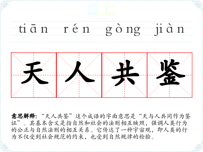“天人共鉴”这个成语的字面意思是“天与人共同作为鉴证”。其基本含义是指自然和社会的法则相互映照,强调人类行为的公正与自然法则的相互关系。它传达了一种宇宙观,即人类的行为不仅受到社会规范的约束,也受到自然规律的检验。
