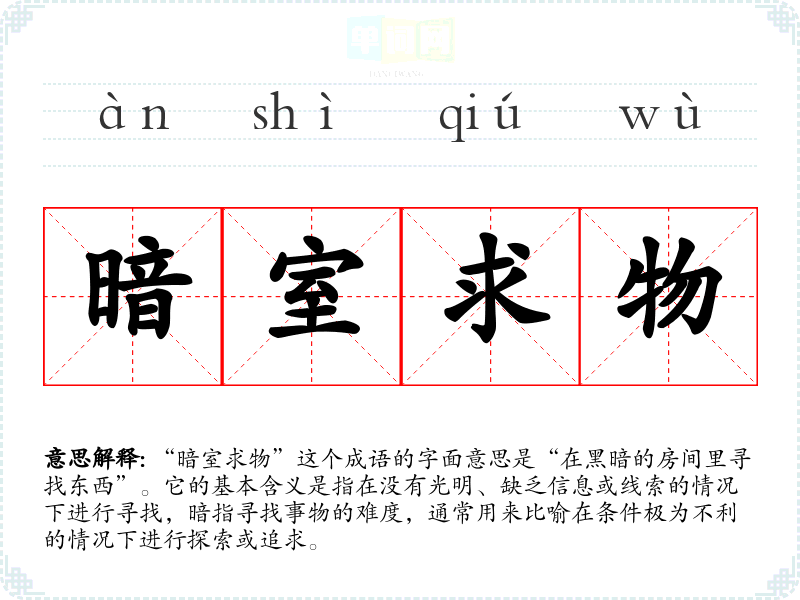 “暗室求物”这个成语的字面意思是“在黑暗的房间里寻找东西”。它的基本含义是指在没有光明、缺乏信息或线索的情况下进行寻找,暗指寻找事物的难度,通常用来比喻在条件极为不利的情况下进行探索或追求。