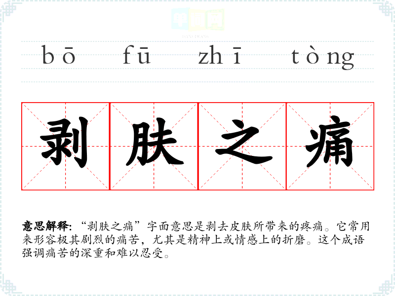 “剥肤之痛”字面意思是剥去皮肤所带来的疼痛。它常用来形容极其剧烈的痛苦,尤其是精神上或情感上的折磨。这个成语强调痛苦的深重和难以忍受。