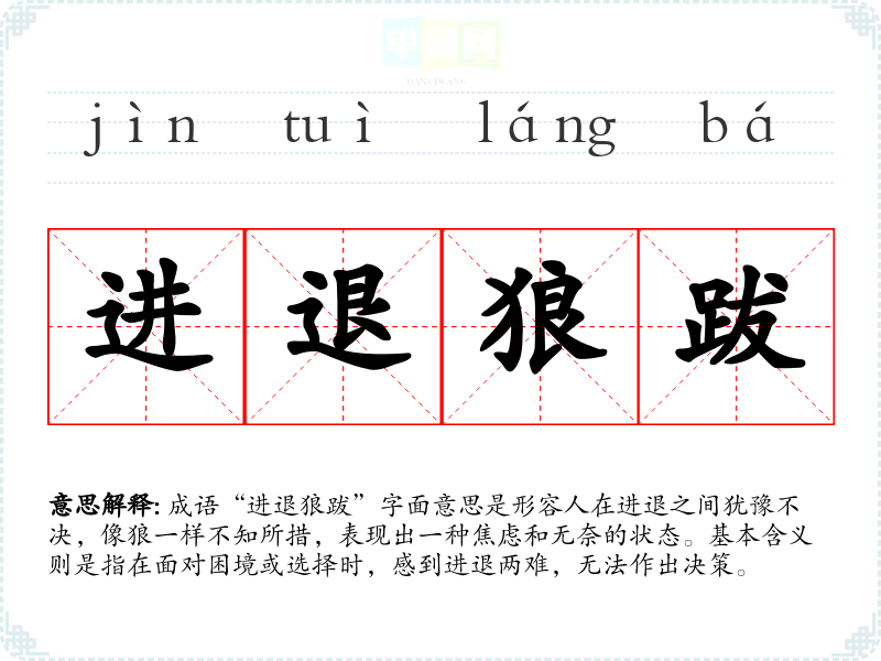 成语“进退狼跋”字面意思是形容人在进退之间犹豫不决,像狼一样不知所措,表现出一种焦虑和无奈的状态。基本含义则是指在面对困境或选择时,感到进退两难,无法作出决策。