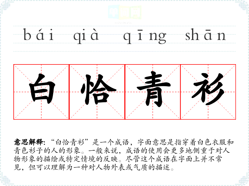“白恰青衫”是一个成语,字面意思是指穿着白色衣服和青色衫子的人的形象。一般来说,成语的使用会更多地侧重于对人物形象的描绘或特定情境的反映。尽管这个成语在字面上并不常见,但可以理解为一种对人物外表或气质的描述。