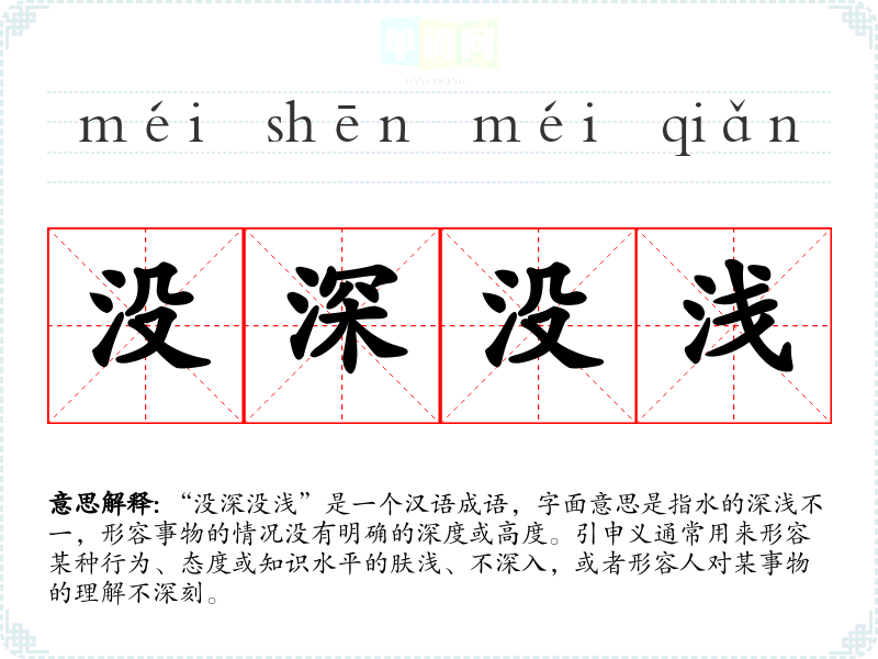“没深没浅”是一个汉语成语,字面意思是指水的深浅不一,形容事物的情况没有明确的深度或高度。引申义通常用来形容某种行为、态度或知识水平的肤浅、不深入,或者形容人对某事物的理解不深刻。