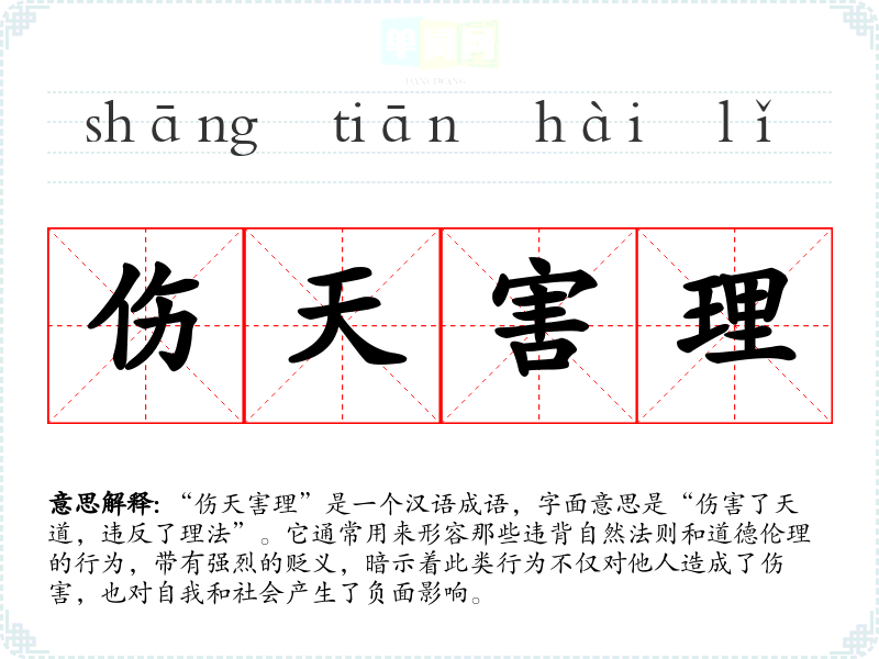 “伤天害理”是一个汉语成语,字面意思是“伤害了天道,违反了理法”。它通常用来形容那些违背自然法则和道德伦理的行为,带有强烈的贬义,暗示着此类行为不仅对他人造成了伤害,也对自我和社会产生了负面影响。