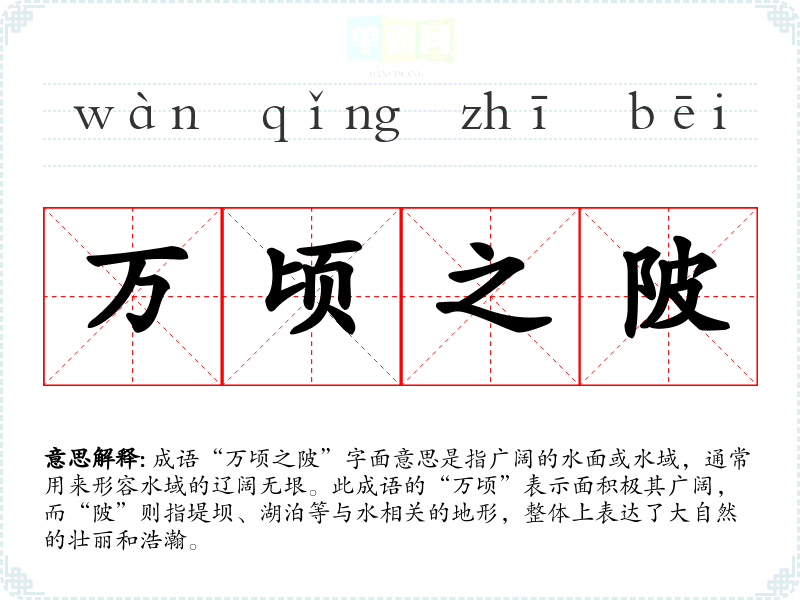 成语“万顷之陂”字面意思是指广阔的水面或水域,通常用来形容水域的辽阔无垠。此成语的“万顷”表示面积极其广阔,而“陂”则指堤坝、湖泊等与水相关的地形,整体上表达了大自然的壮丽和浩瀚。