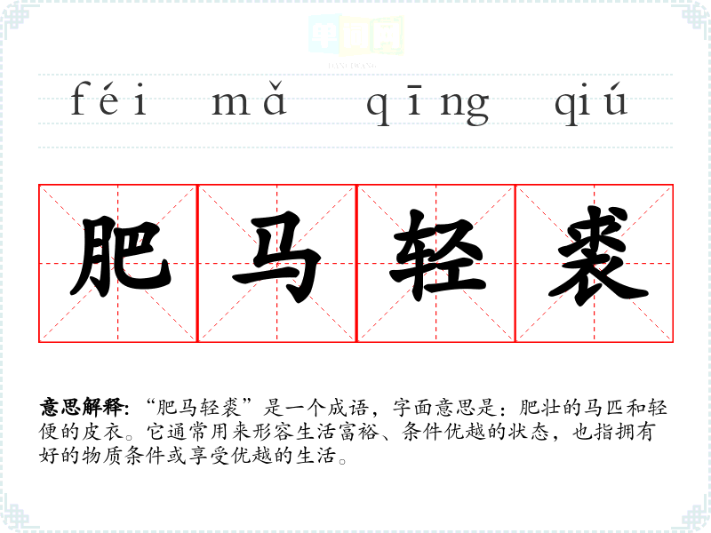 “肥马轻裘”是一个成语,字面意思是:肥壮的马匹和轻便的皮衣。它通常用来形容生活富裕、条件优越的状态,也指拥有好的物质条件或享受优越的生活。