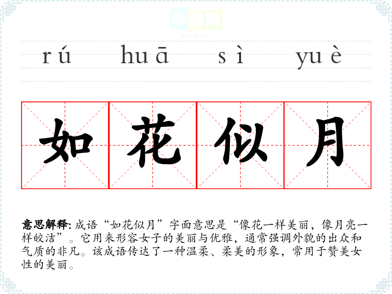 成语“如花似月”字面意思是“像花一样美丽,像月亮一样皎洁”。它用来形容女子的美丽与优雅,通常强调外貌的出众和气质的非凡。该成语传达了一种温柔、柔美的形象,常用于赞美女性的美丽。
