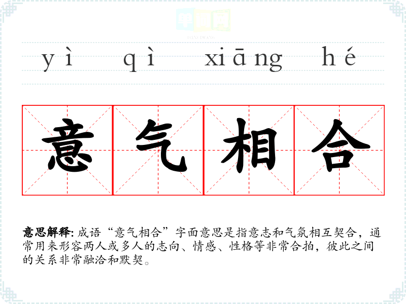 成语“意气相合”字面意思是指意志和气氛相互契合,通常用来形容两人或多人的志向、情感、性格等非常合拍,彼此之间的关系非常融洽和默契。