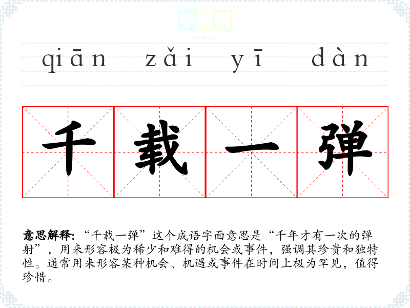 “千载一弹”这个成语字面意思是“千年才有一次的弹射”,用来形容极为稀少和难得的机会或,强调其珍贵和独特性。通常用来形容某种机会、机遇或在时间上极为罕见,值得珍惜。