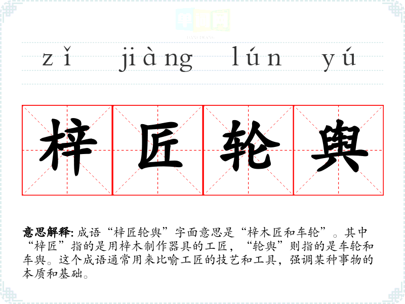 成语“梓匠轮舆”字面意思是“梓木匠和车轮”。其中“梓匠”指的是用梓木制作器具的工匠,“轮舆”则指的是车轮和车舆。这个成语通常用来比喻工匠的技艺和工具,强调某种事物的本质和基础。