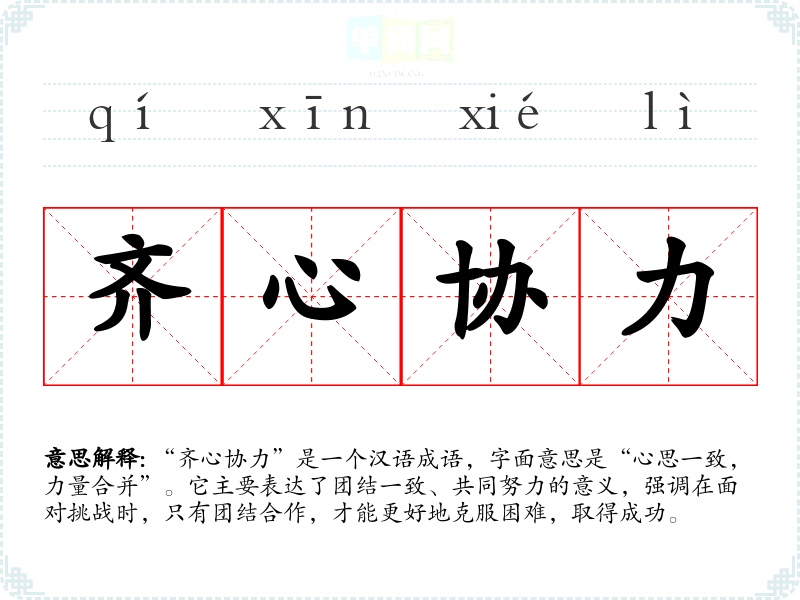 “齐心协力”是一个汉语成语,字面意思是“心思一致,力量合并”。它主要表达了团结一致、共同努力的意义,强调在面对挑战时,只有团结合作,才能更好地克服困难,取得成功。