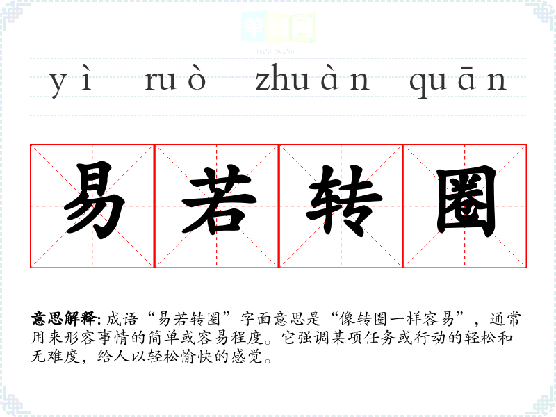成语“易若转圈”字面意思是“像转圈一样容易”,通常用来形容事情的简单或容易程度。它强调某项任务或行动的轻松和无难度,给人以轻松愉快的感觉。