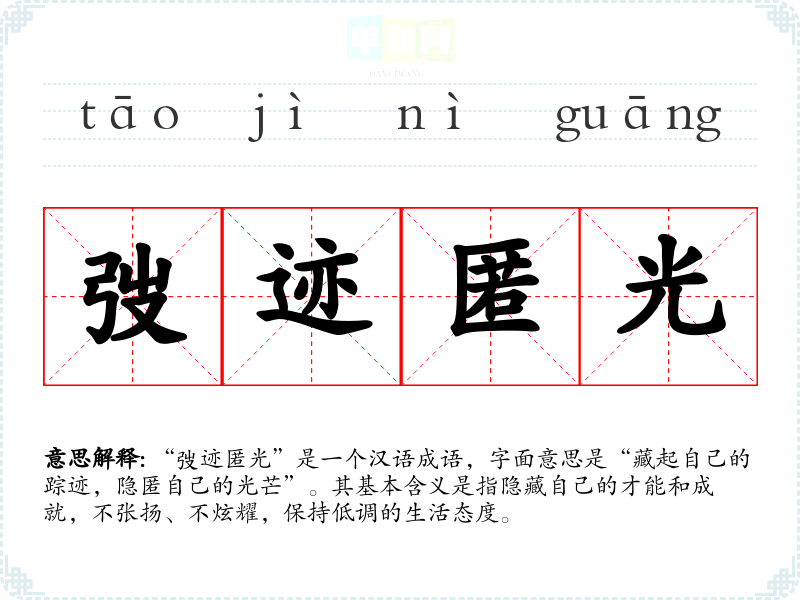 “弢迹匿光”是一个汉语成语,字面意思是“藏起自己的踪迹,隐匿自己的光芒”。其基本含义是指隐藏自己的才能和成就,不张扬、不炫耀,保持低调的生活态度。
