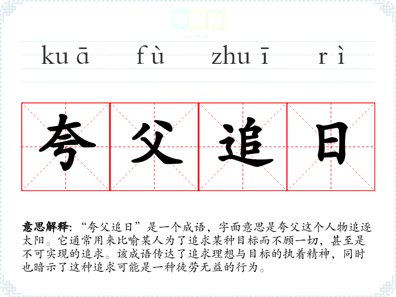 “夸父追日”是一个成语,字面意思是夸父这个人物追逐太阳。它通常用来比喻某人为了追求某种目标而不顾一切,甚至是不可实现的追求。该成语传达了追求理想与目标的执着精神,同时也暗示了这种追求可能是一种徒劳无益的行为。