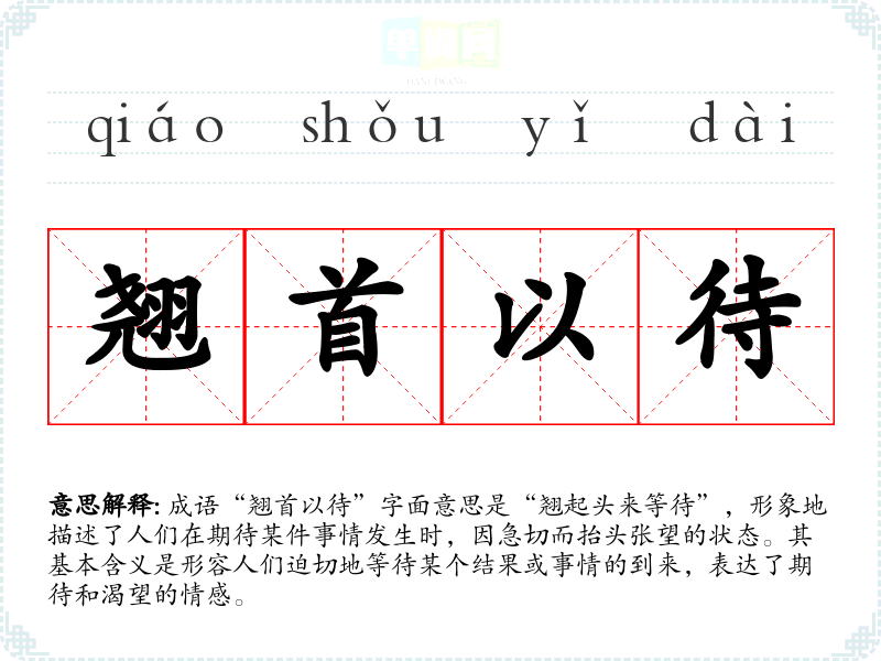 成语“翘首以待”字面意思是“翘起头来等待”,形象地描述了人们在期待某件事情发生时,因急切而抬头张望的状态。其基本含义是形容人们迫切地等待某个结果或事情的到来,表达了期待和渴望的情感。