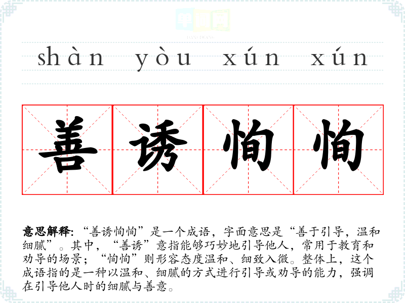 “善诱恂恂”是一个成语,字面意思是“善于引导,温和细腻”。其中,“善诱”意指能够巧妙地引导他人,常用于教育和劝导的场景;“恂恂”则形容态度温和、细致入微。整体上,这个成语指的是一种以温和、细腻的方式进行引导或劝导的能力,强调在引导他人时的细腻与善意。