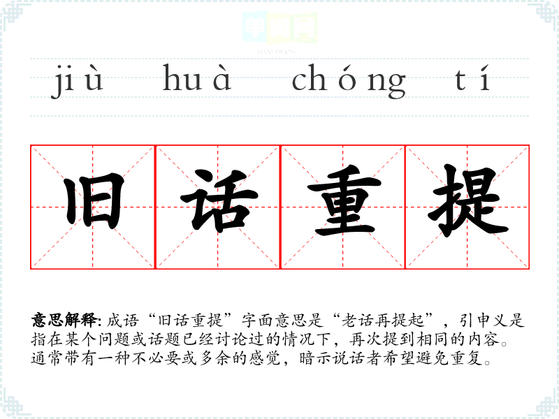 成语“旧话重提”字面意思是“老话再提起”,引申义是指在某个问题或话题已经讨论过的情况下,再次提到相同的内容。通常带有一种不必要或多余的感觉,暗示说话者希望避免重复。