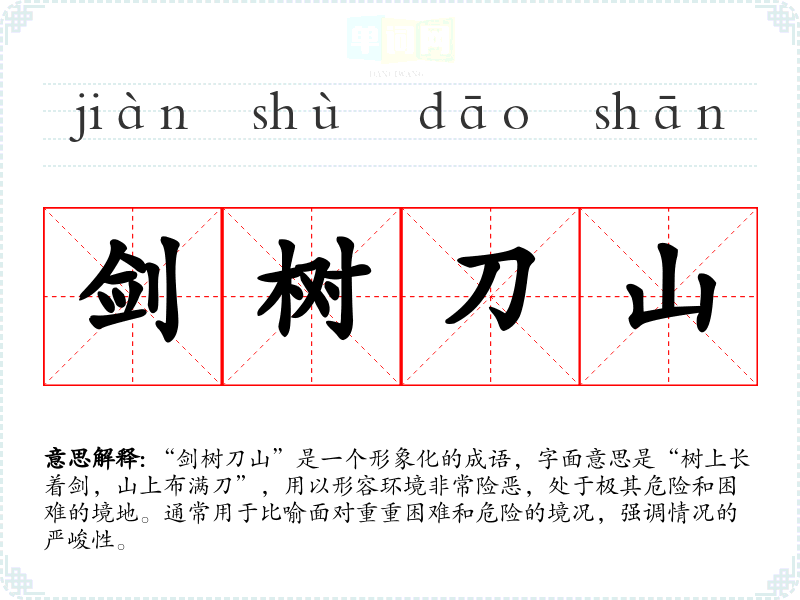 “剑树刀山”是一个形象化的成语,字面意思是“树上长着剑,山上布满刀”,用以形容环境非常险恶,处于极其危险和困难的境地。通常用于比喻面对重重困难和危险的境况,强调情况的严峻性。