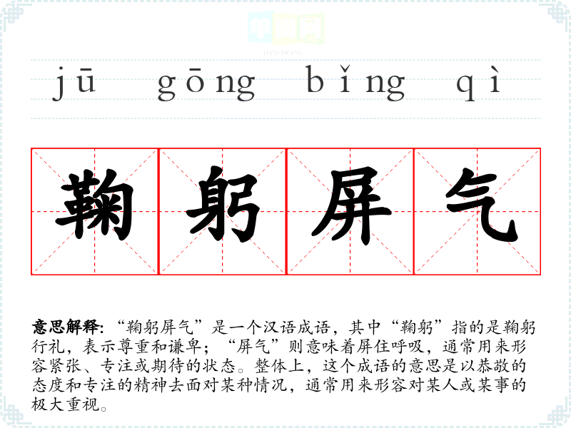 “鞠躬屏气”是一个汉语成语,其中“鞠躬”指的是鞠躬行礼,表示尊重和谦卑;“屏气”则意味着屏住呼吸,通常用来形容紧张、专注或期待的状态。整体上,这个成语的意思是以恭敬的态度和专注的精神去面对某种情况,通常用来形容对某人或某事的极大重视。