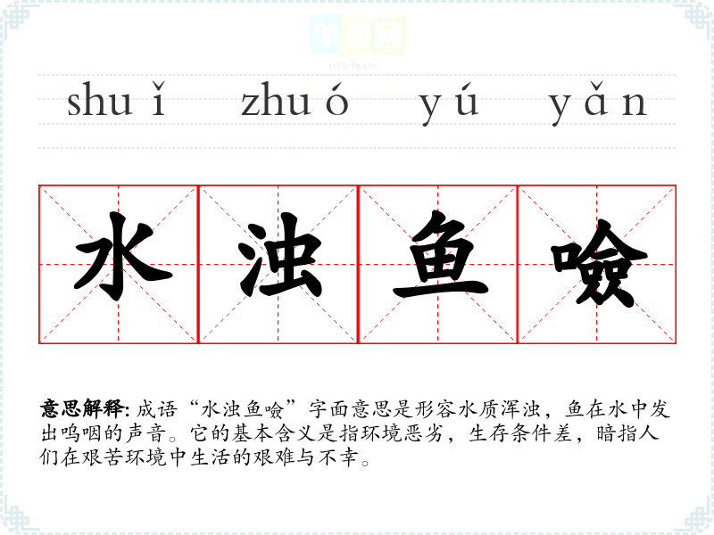 成语“水浊鱼噞”字面意思是形容水质浑浊,鱼在水中发出呜咽的声音。它的基本含义是指环境恶劣,生存条件差,暗指人们在艰苦环境中生活的艰难与不幸。
