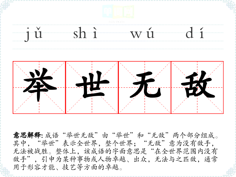 成语“举世无敌”由“举世”和“无敌”两个部分组成。其中,“举世”表示全世界,整个世界;“无敌”意为没有敌手,无法被战胜。整体上,该成语的字面意思是“在全世界范围内没有敌手”,引申为某种事物或人物卓越、出众,无法与之匹敌,通常用于形容才能、技艺等方面的卓越。