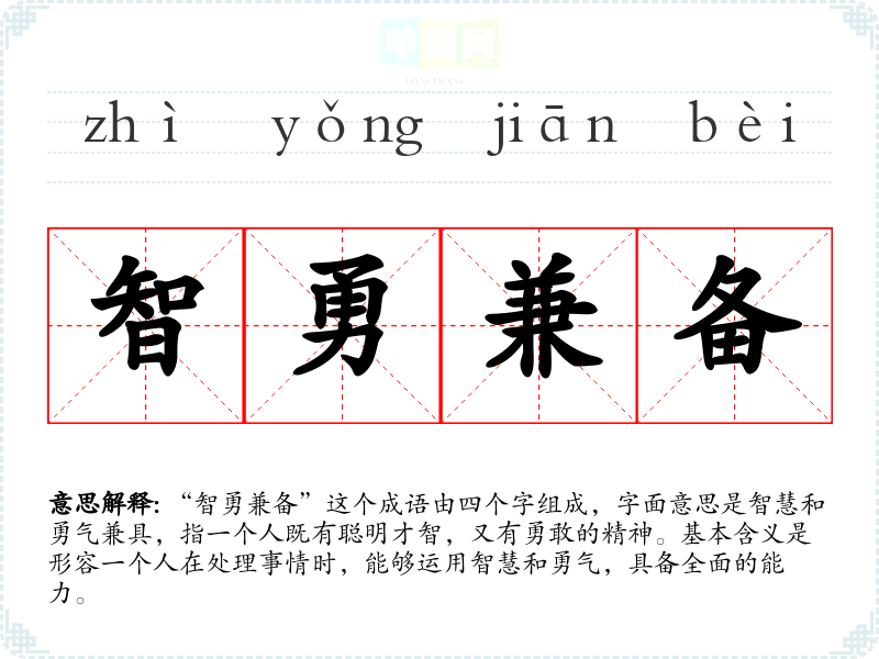 “智勇兼备”这个成语由四个字组成,字面意思是智慧和勇气兼具,指一个人既有聪明才智,又有勇敢的精神。基本含义是形容一个人在处理事情时,能够运用智慧和勇气,具备全面的能力。