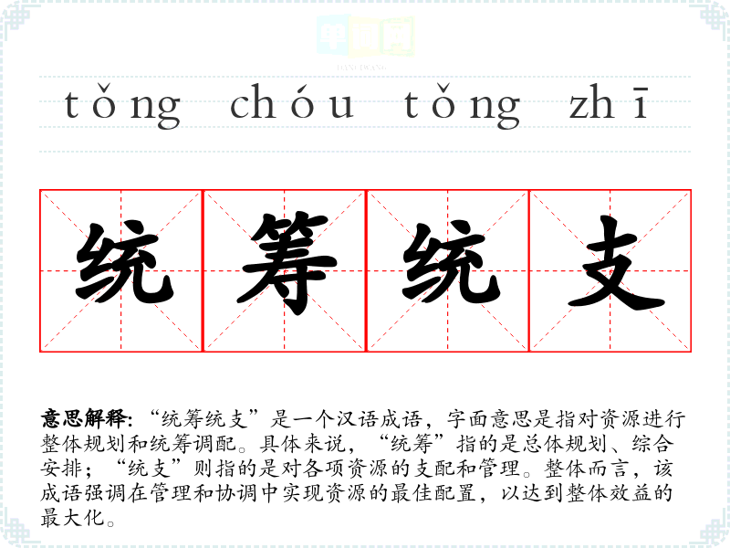 “统筹统支”是一个汉语成语,字面意思是指对资源进行整体规划和统筹调配。具体来说,“统筹”指的是总体规划、综合安排;“统支”则指的是对各项资源的支配和管理。整体而言,该成语强调在管理和协调中实现资源的最佳配置,以达到整体效益的最大化。