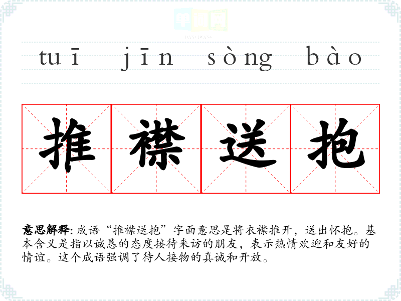 成语“推襟送抱”字面意思是将衣襟推开,送出怀抱。基本含义是指以诚恳的态度接待来访的朋友,表示热情欢迎和友好的情谊。这个成语强调了待人接物的真诚和开放。