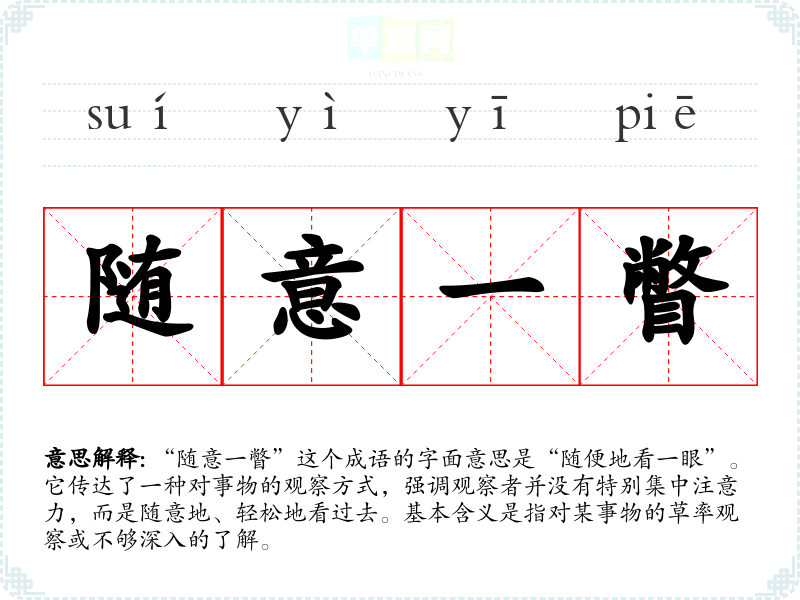 “随意一瞥”这个成语的字面意思是“随便地看一眼”。它传达了一种对事物的观察方式,强调观察者并没有特别集中注意力,而是随意地、轻松地看过去。基本含义是指对某事物的草率观察或不够深入的了解。