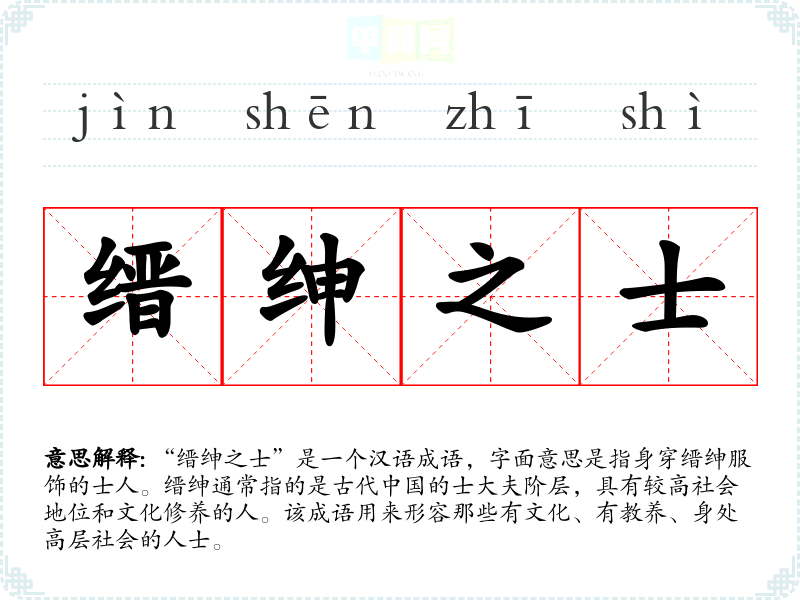 “缙绅”一词源于古代的官服,缙是指一种深青色的丝绸,绅是指一种带有装饰的腰带,古代士人和官员在正式场合穿着此类衣服以示身份。因此,“缙绅之士”从字面上看就是指那些穿着这种服饰的士人。该成语的使用可以追溯到元明时期的文人作品中,尤其是在描述士大夫阶层的社会地位和文化身份时。