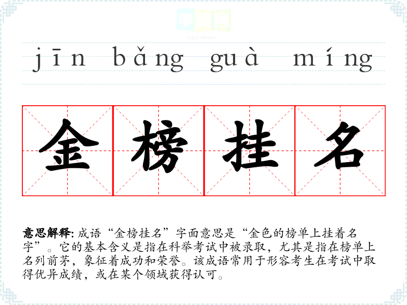 成语“金榜挂名”字面意思是“金色的榜单上挂着名字”。它的基本含义是指在科举考试中被录取,尤其是指在榜单上名列前茅,象征着成功和荣誉。该成语常用于形容考生在考试中取得优异成绩,或在某个领域获得认可。