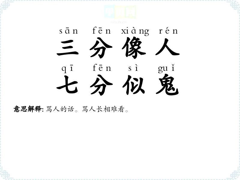 | 三分像人,七分似鬼 | 骂人的话。骂人长相难看。 |
