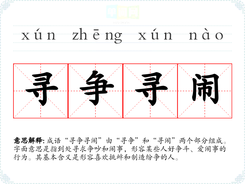 成语“寻争寻闹”由“寻争”和“寻闹”两个部分组成。字面意思是指到处寻求争吵和闹事,形容某些人好争斗、爱闹事的行为。其基本含义是形容喜欢挑衅和制造纷争的人。