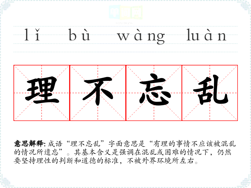 成语“理不忘乱”字面意思是“有理的事情不应该被混乱的情况所遗忘”。其基本含义是强调在混乱或困难的情况下,仍然要坚持理性的判断和道德的标准,不被外界环境所左右。