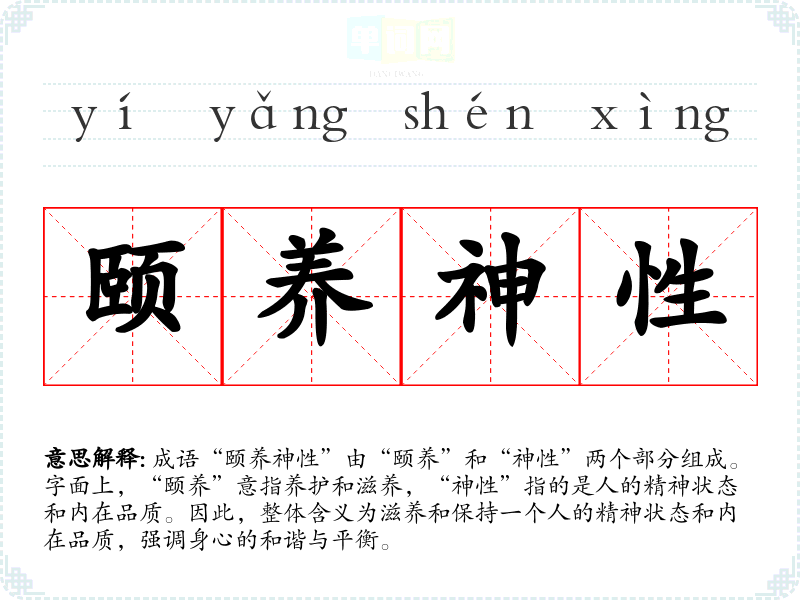 成语“颐养神性”由“颐养”和“神性”两个部分组成。字面上,“颐养”意指养护和滋养,“神性”指的是人的精神状态和内在品质。因此,整体含义为滋养和保持一个人的精神状态和内在品质,强调身心的和谐与平衡。