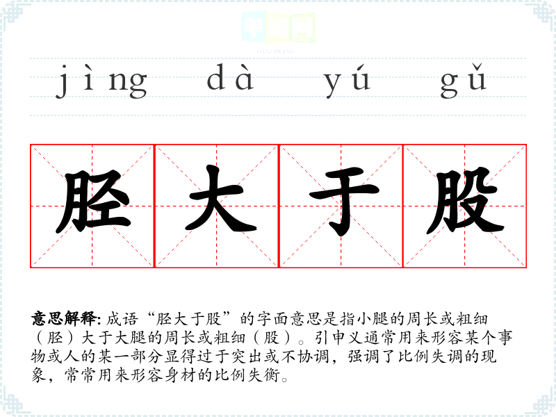 成语“胫大于股”的字面意思是指小腿的周长或粗细(胫)大于大腿的周长或粗细(股)。引申义通常用来形容某个事物或人的某一部分显得过于突出或不协调,强调了比例失调的现象,常常用来形容身材的比例失衡。