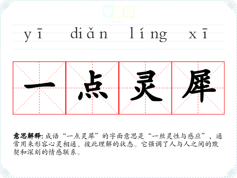 成语“一点灵犀”的字面意思是“一丝灵性与感应”,通常用来形容心灵相通、彼此理解的状态。它强调了人与人之间的默契和深刻的情感联系。