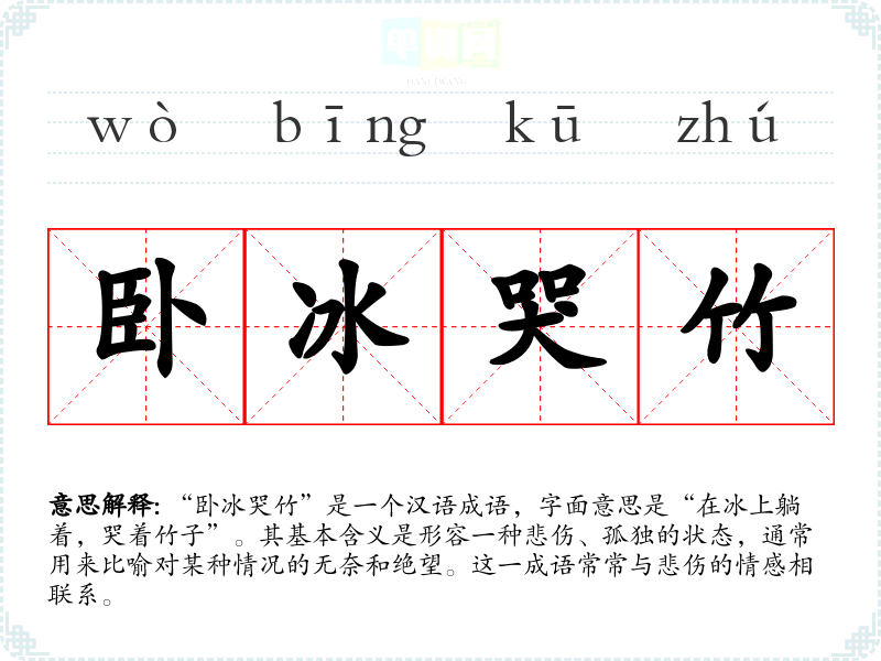 “卧冰哭竹”是一个汉语成语,字面意思是“在冰上躺着,哭着竹子”。其基本含义是形容一种悲伤、孤独的状态,通常用来比喻对某种情况的无奈和绝望。这一成语常常与悲伤的情感相联系。