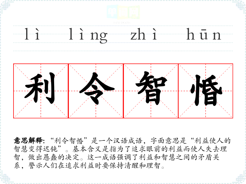 | 利令志惛 | 因贪图私利而失去理智,把什么都忘了。同“利令智昏”。 |