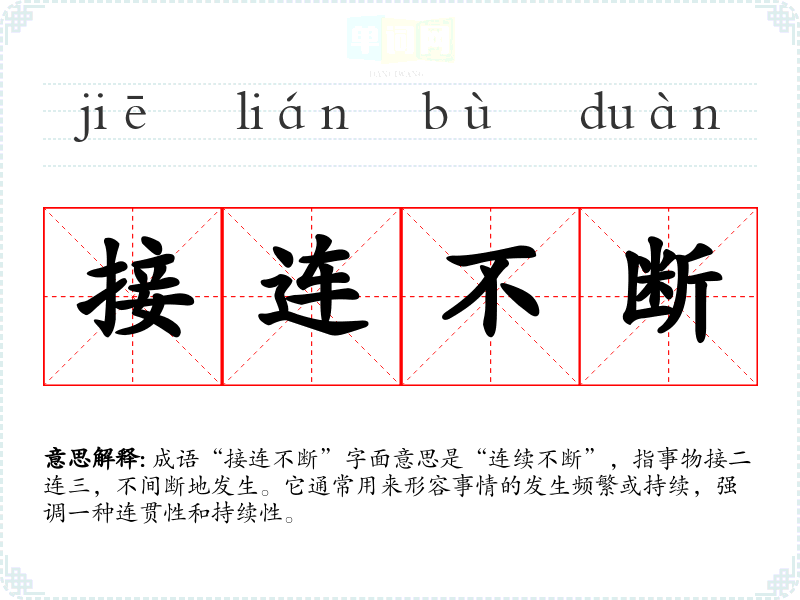 成语“接连不断”字面意思是“连续不断”,指事物接二连三,不间断地发生。它通常用来形容事情的发生频繁或持续,强调一种连贯性和持续性。
