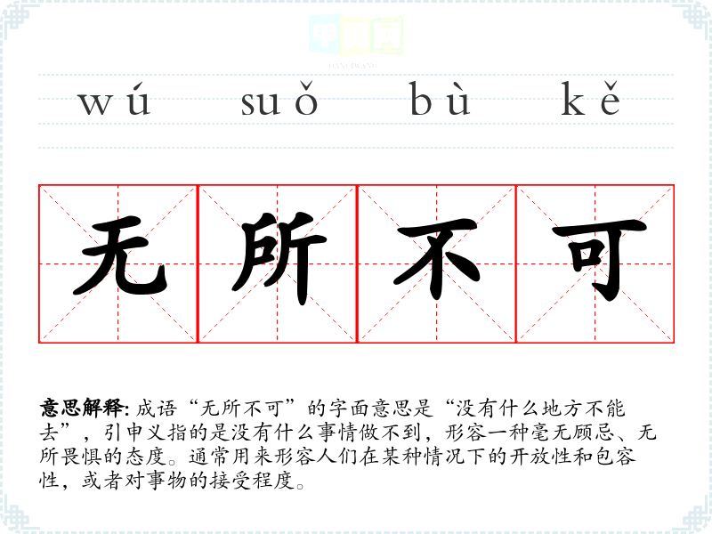 成语“无所不可”的字面意思是“没有什么地方不能去”,引申义指的是没有什么事情做不到,形容一种毫无顾忌、无所畏惧的态度。通常用来形容人们在某种情况下的开放性和包容性,或者对事物的接受程度。