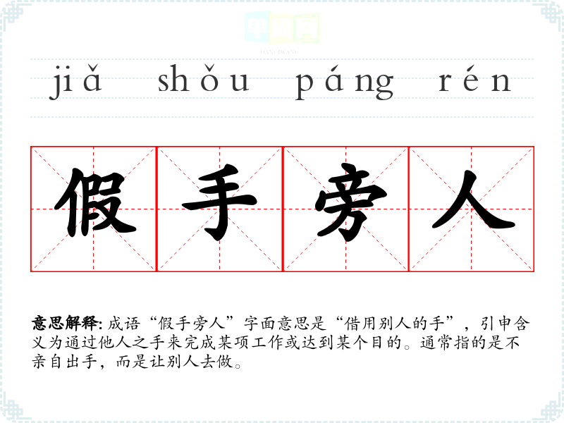 成语“假手旁人”字面意思是“借用别人的手”,引申含义为通过他人之手来完成某项工作或达到某个目的。通常指的是不亲自出手,而是让别人去做。