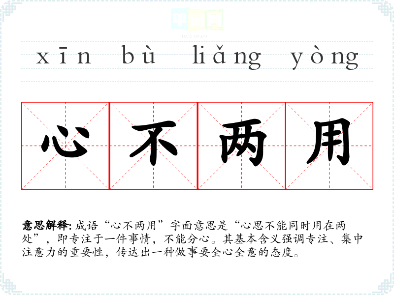 成语“心不两用”字面意思是“心思不能同时用在两处”,即专注于一件事情,不能分心。其基本含义强调专注、集中注意力的重要性,传达出一种做事要全心全意的态度。