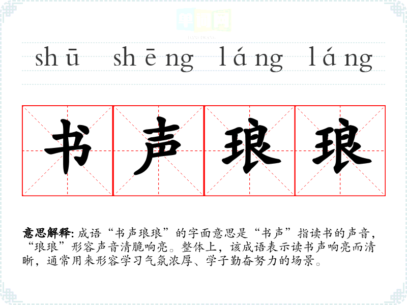 | 书声朗朗 | 形容读书声音清朗而响亮。 |