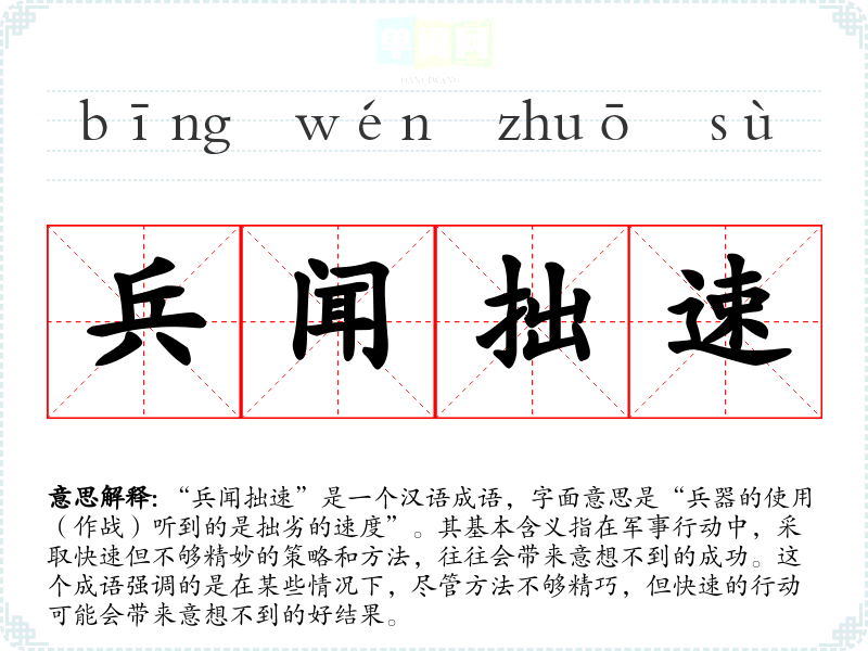 “兵闻拙速”是一个汉语成语,字面意思是“兵器的使用(作战)听到的是拙劣的速度”。其基本含义指在军事行动中,采取快速但不够精妙的策略和方法,往往会带来意想不到的成功。这个成语强调的是在某些情况下,尽管方法不够精巧,但快速的行动可能会带来意想不到的好结果。