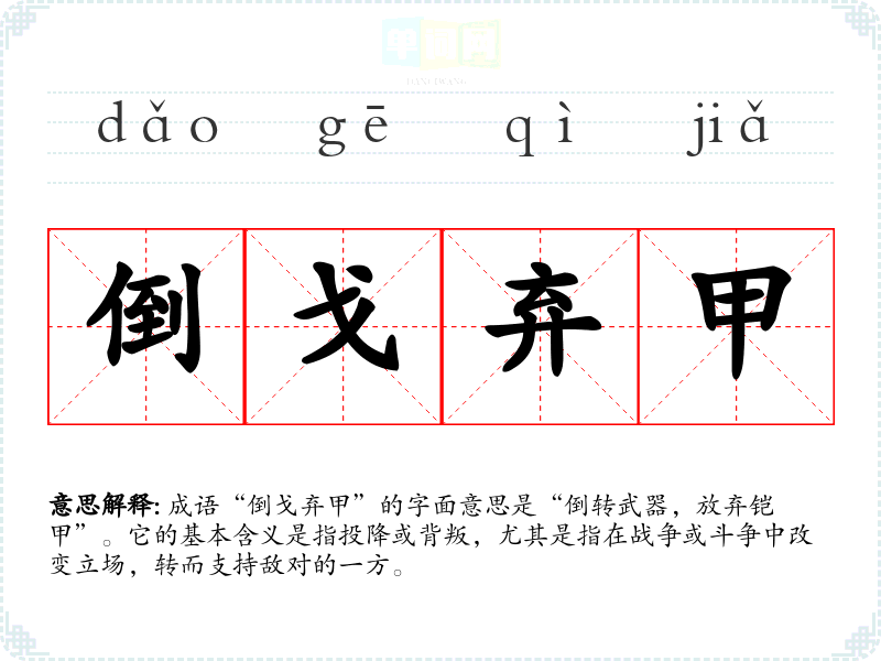 成语“倒戈弃甲”的字面意思是“倒转武器,放弃铠甲”。它的基本含义是指投降或背叛,尤其是指在战争或斗争中改变立场,转而支持敌对的一方。