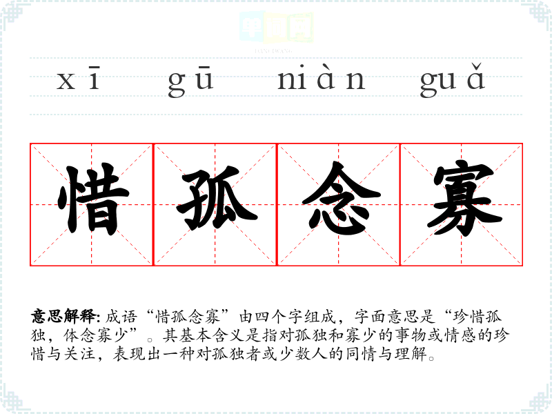成语“惜孤念寡”由四个字组成,字面意思是“珍惜孤独,体念寡少”。其基本含义是指对孤独和寡少的事物或情感的珍惜与关注,表现出一种对孤独者或少数人的同情与理解。