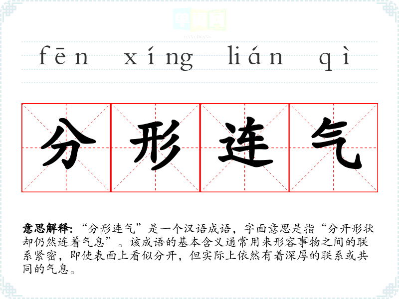 “分形连气”是一个汉语成语,字面意思是指“分开形状却仍然连着气息”。该成语的基本含义通常用来形容事物之间的联系紧密,即使表面上看似分开,但实际上依然有着深厚的联系或共同的气息。